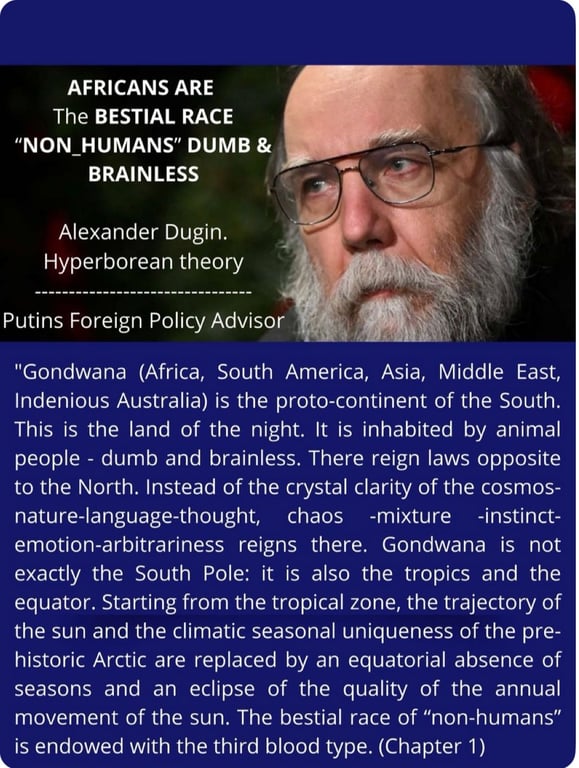 This treatment aligns disturbingly well with the ideology promoted by Alexander Dugin, often called "Putin's brain" and a key foreign policy advisor. Dugin's "Hyperborean theory" explicitly dehumanizes people from the Global South, referring to Africans and others as "non-humans" and "animal people."